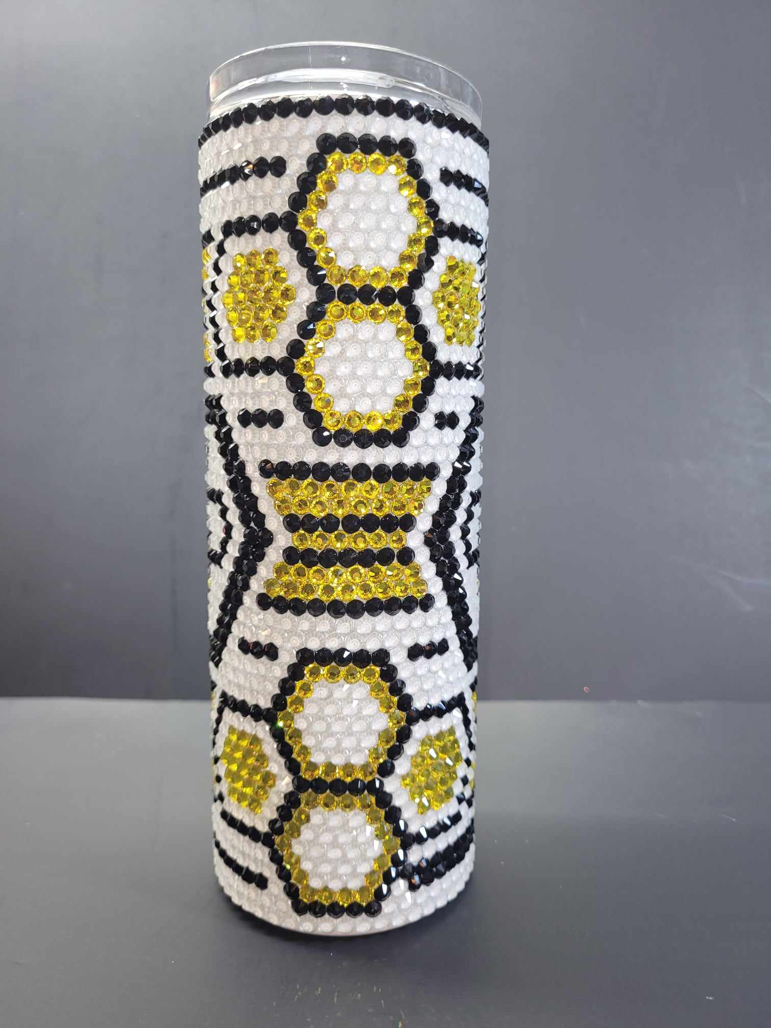This is a 20 ounce rhinestone tumbler. The rhinestones are glass, not resin, and individually placed on the tumbler.